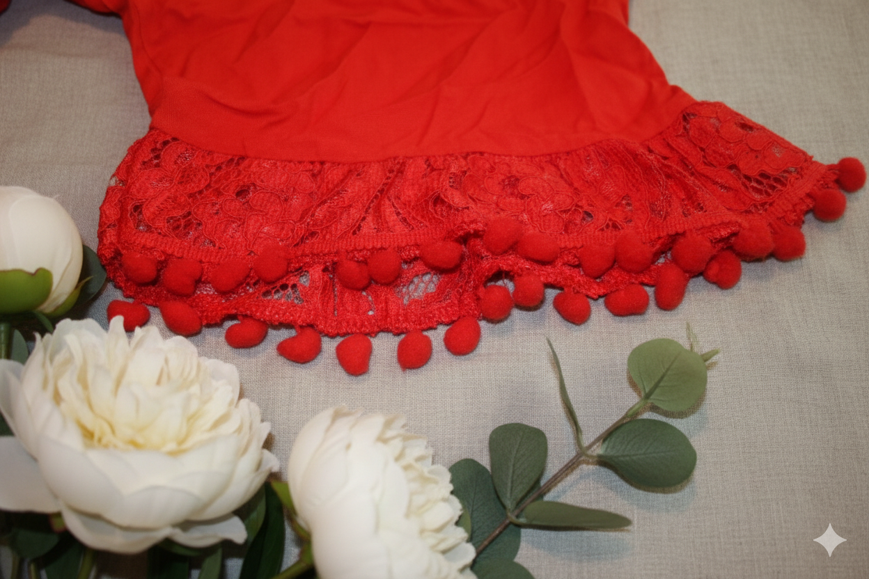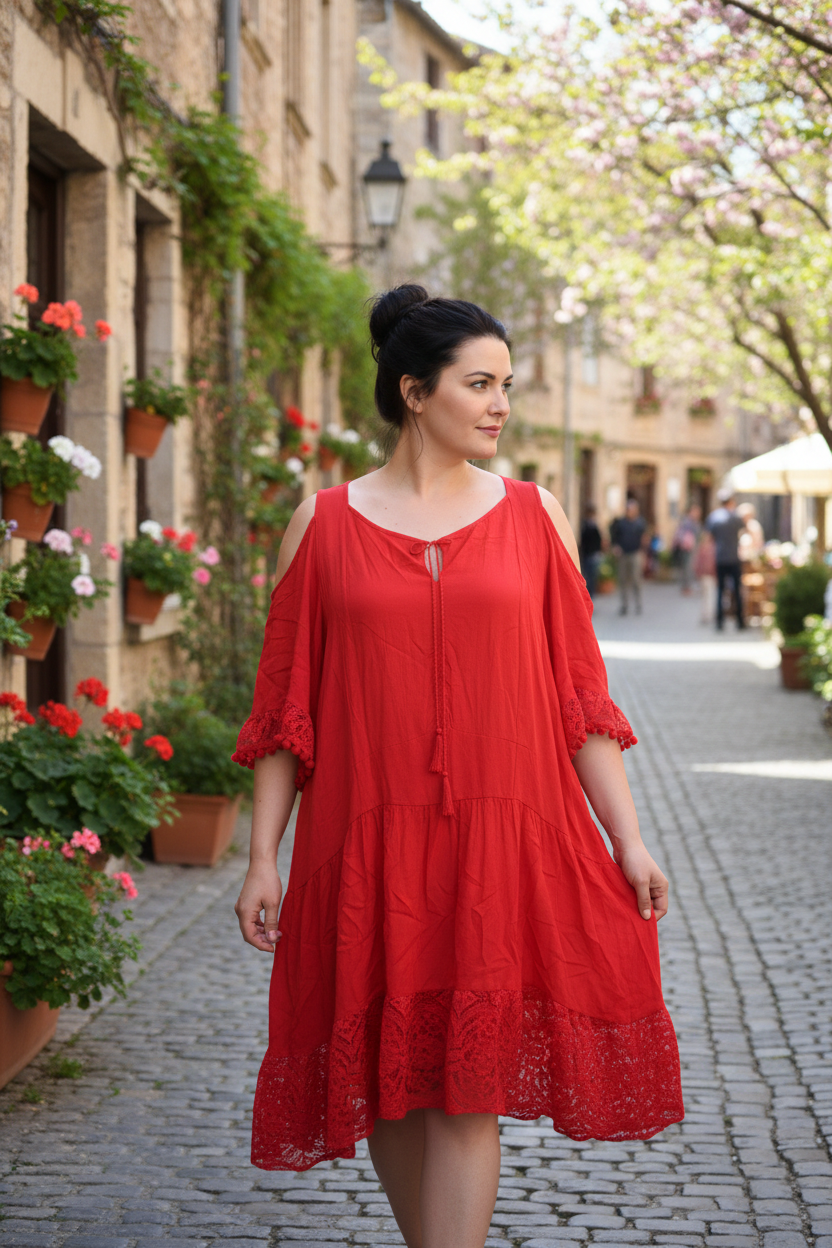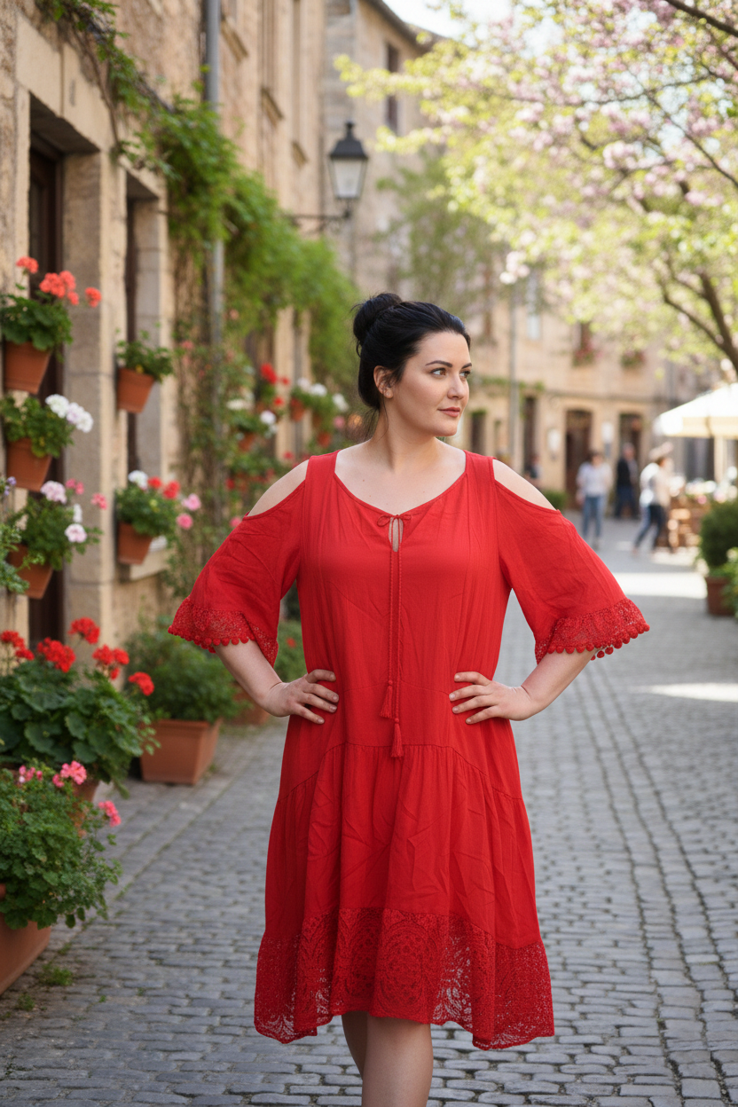Jednofarebné bohémske šaty s čipkou na spodku a na rukávoch. Na koncoch rukávov sú malé mäkké guličky / brmbolčeky. Tieto šaty zvýraznia vašu ženskosť. Látka je vzdušná, príjemne hladivá a padavá,