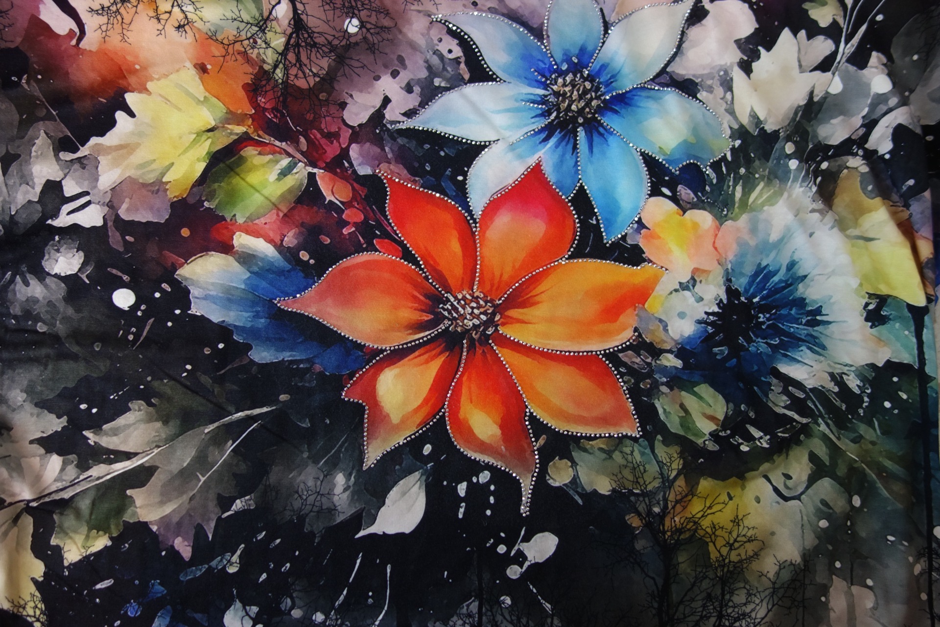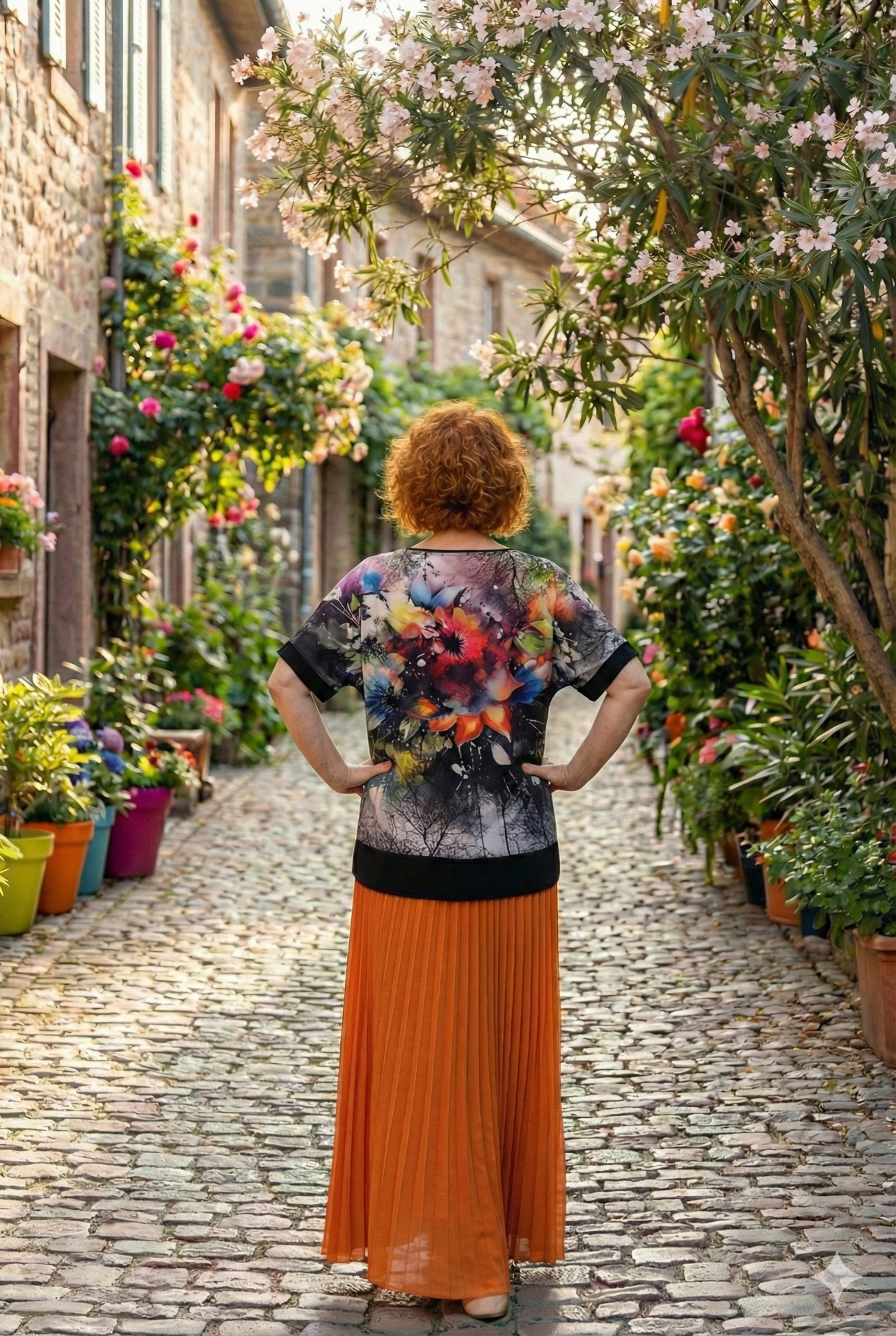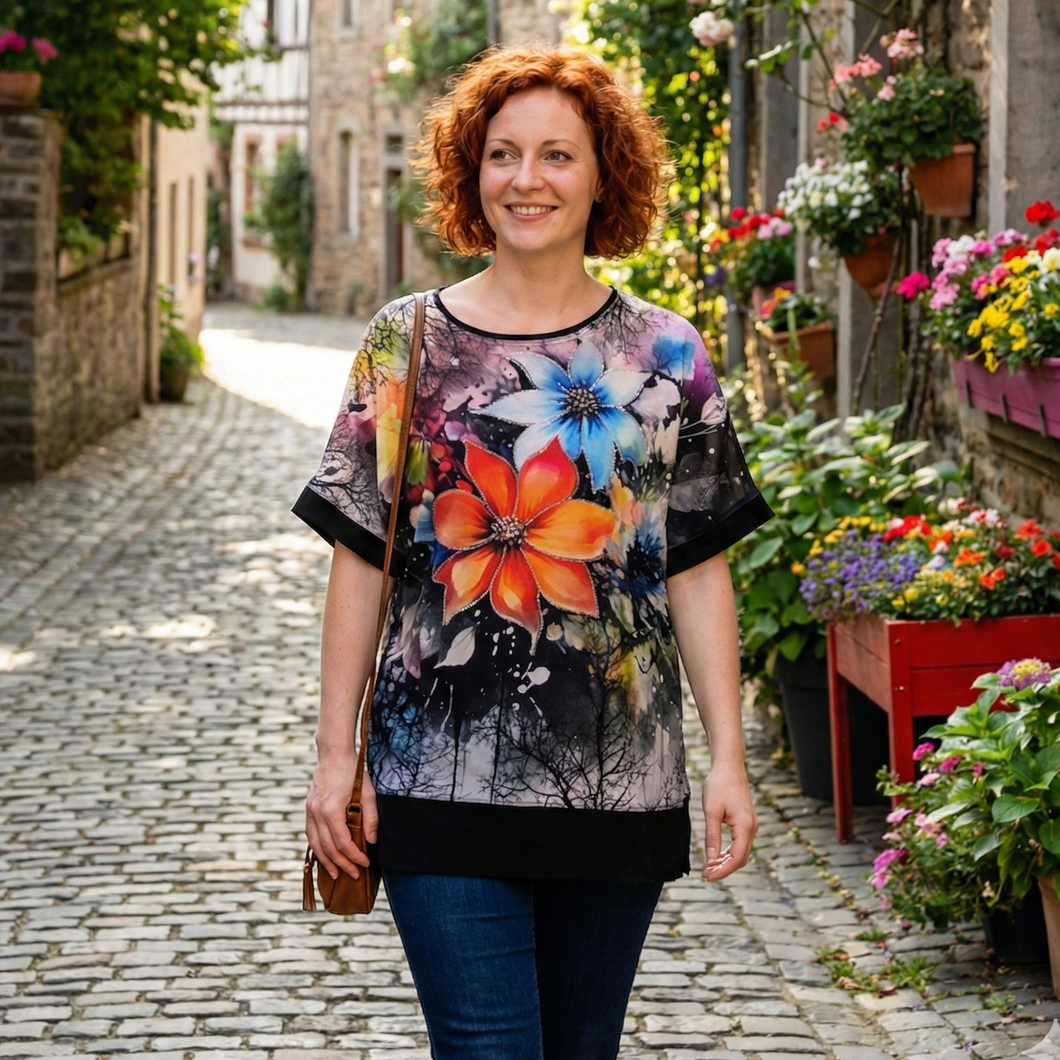 Blúzka so vzorom dvoch veľkých pútavých kvetov. Jeden z nich je oranžovo červený a druhý nad ním vpravo je modrý. Okraje týchto dvoch kvetov sú vykladané striebornými trblietkami. Materiál je jemný a pružný. Strih je široký a voľný, takmer v tvare štvorca. Po bokoch na čiernom páse je blúzka nastrihnutá.