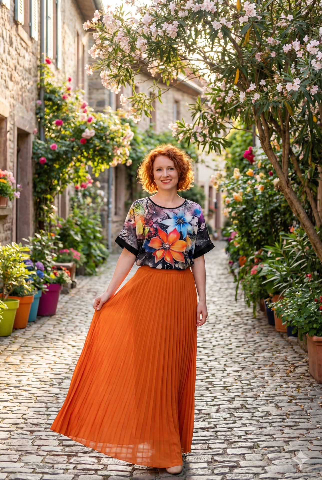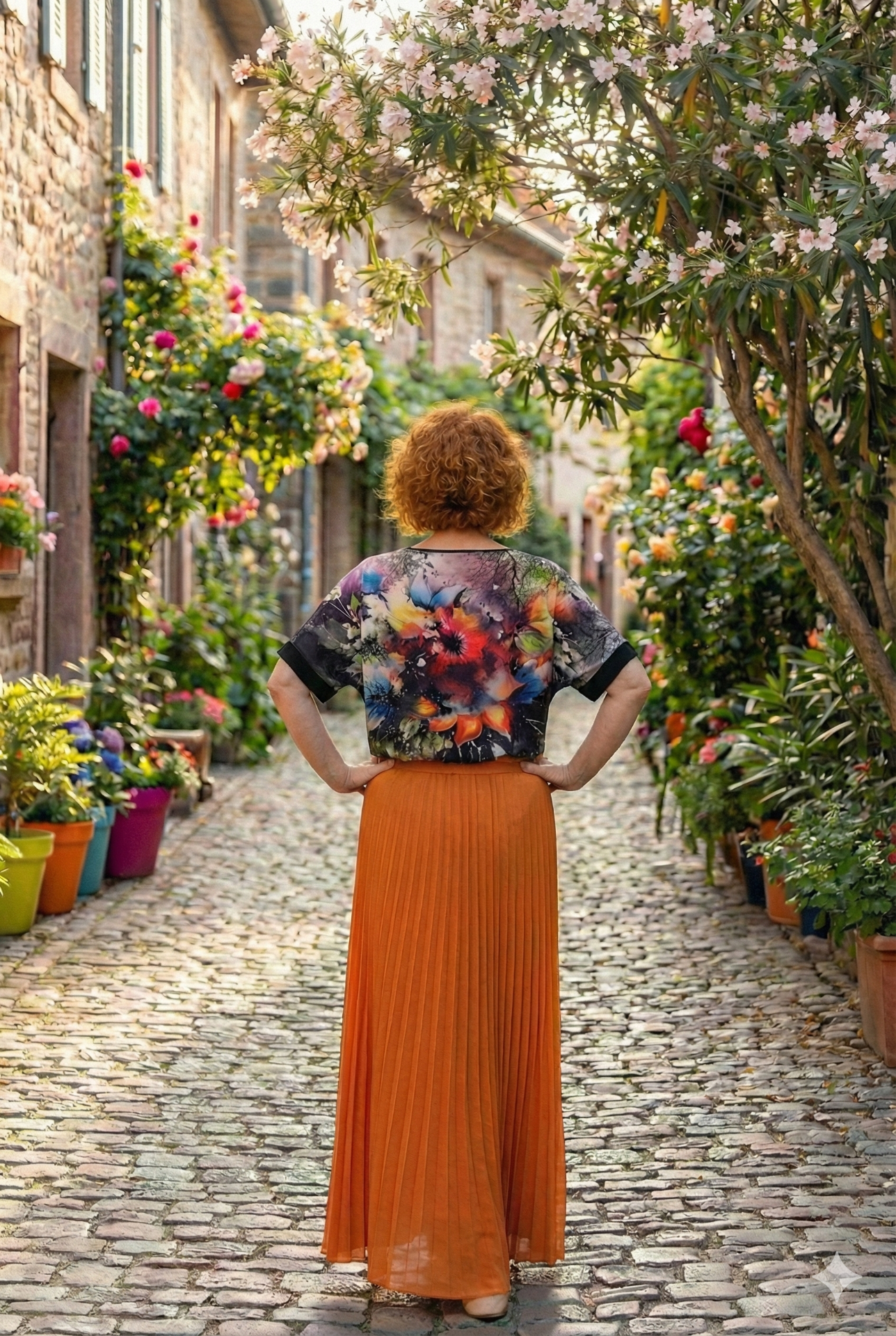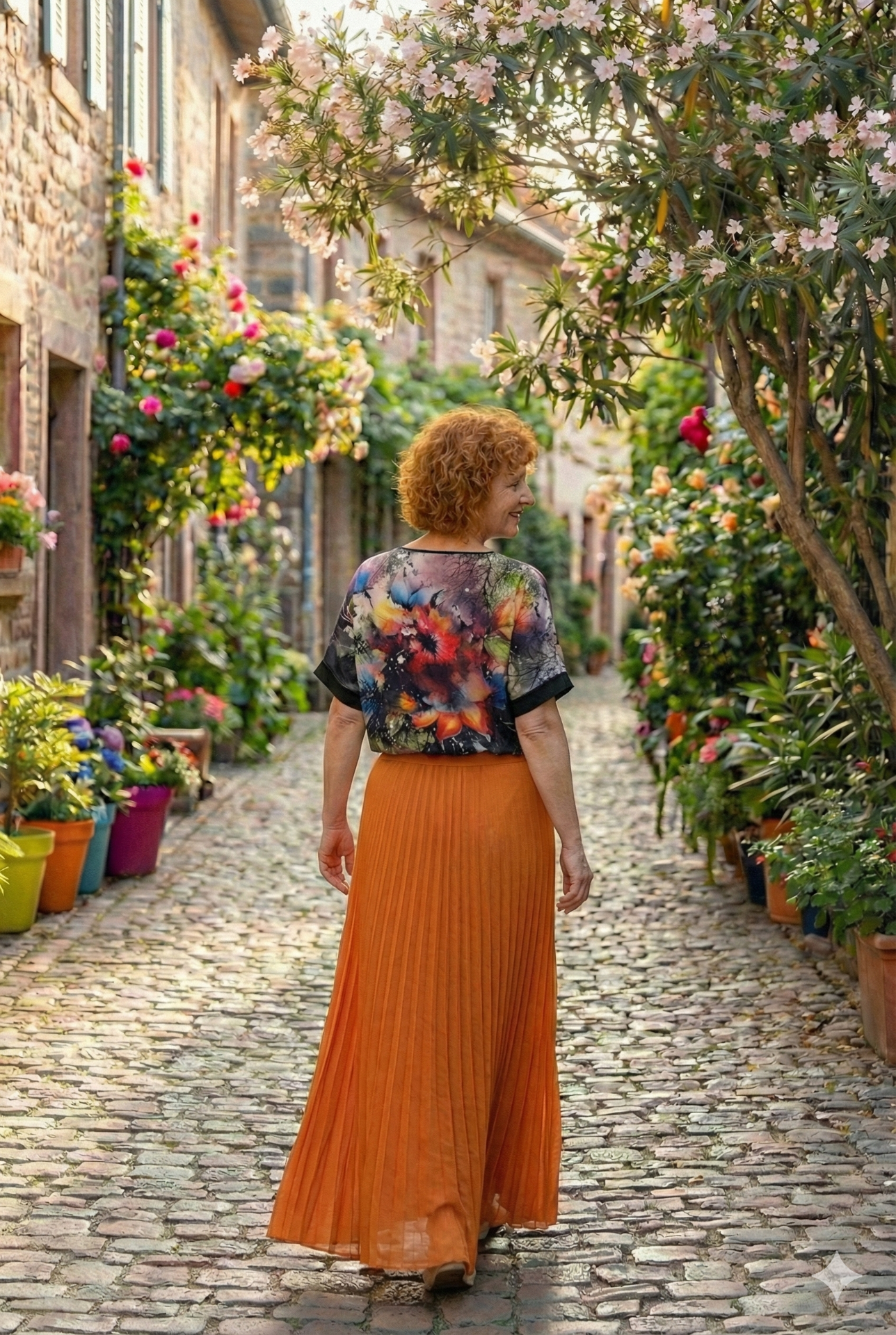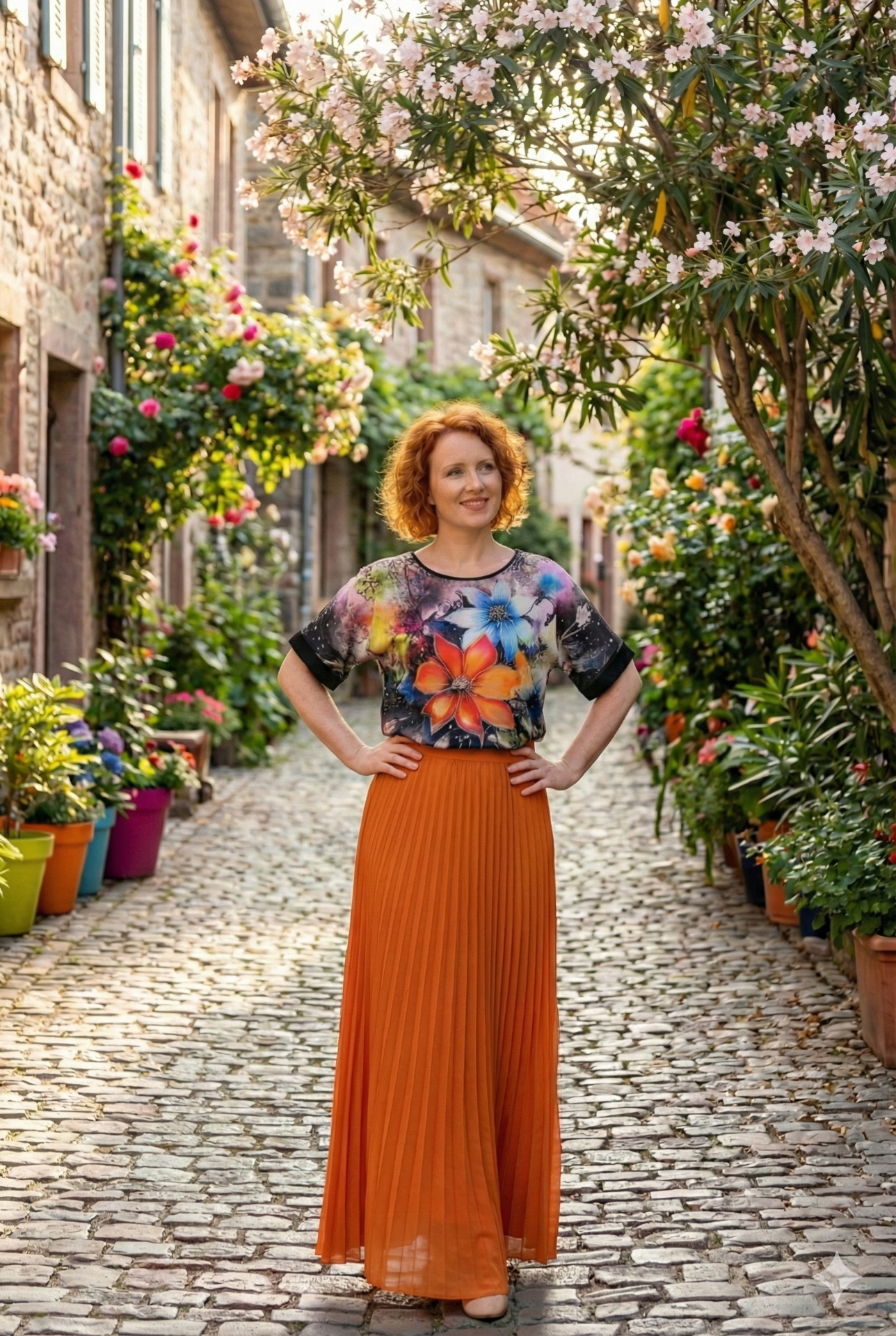 Blúzka so vzorom dvoch veľkých pútavých kvetov. Jeden z nich je oranžovo červený a druhý nad ním vpravo je modrý. Okraje týchto dvoch kvetov sú vykladané striebornými trblietkami. Materiál je jemný a pružný. Strih je široký a voľný, takmer v tvare štvorca. Po bokoch na čiernom páse je blúzka nastrihnutá.