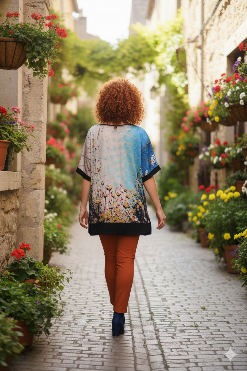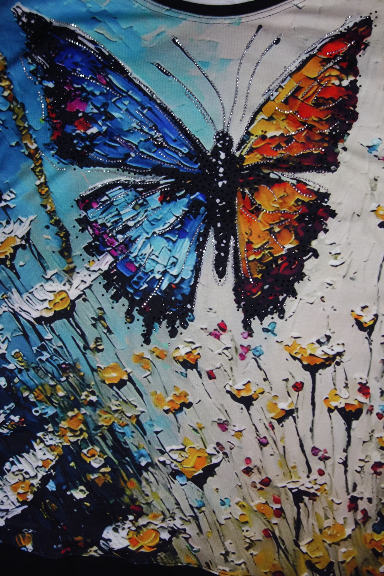 Blúzka so vzorom motýľa na prednej strane a s kvetmi margarétok. Motýľ má na sebe trblietky. Materiál je jemný a pružný. Strih je široký a voľný, takmer v tvare štvorca. Po bokoch na čiernom páse je blúzka nastrihnutá.