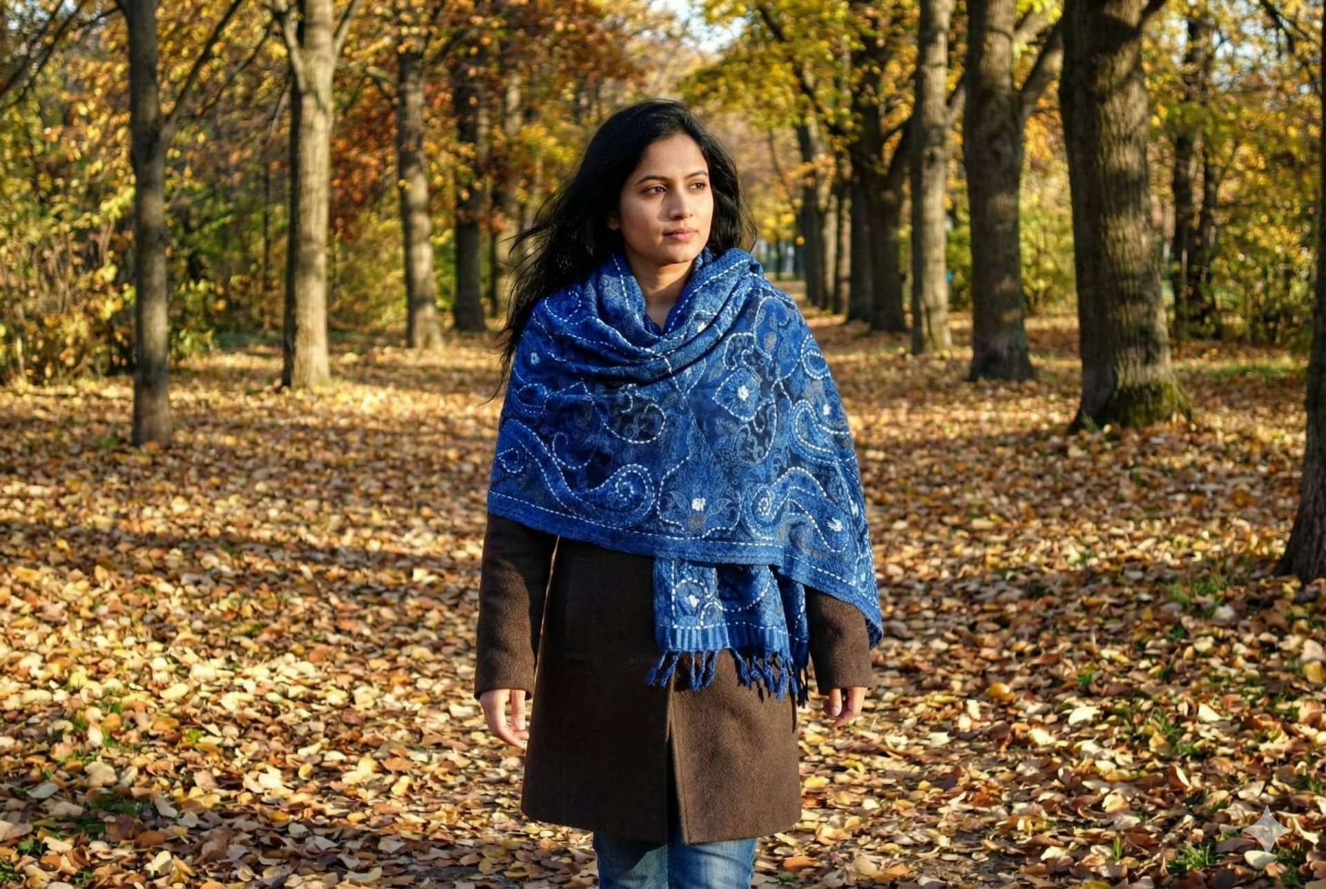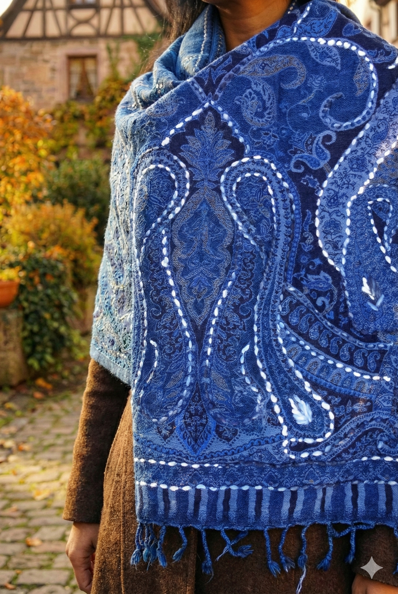 Deková štóla s orientálnym vzorom s vyšívanými aplikáciami svetlou vlnou. Využijete celoročne na rôzne príležitosti. V zime aj na jeseň. So strapcami na oboch koncoch.
