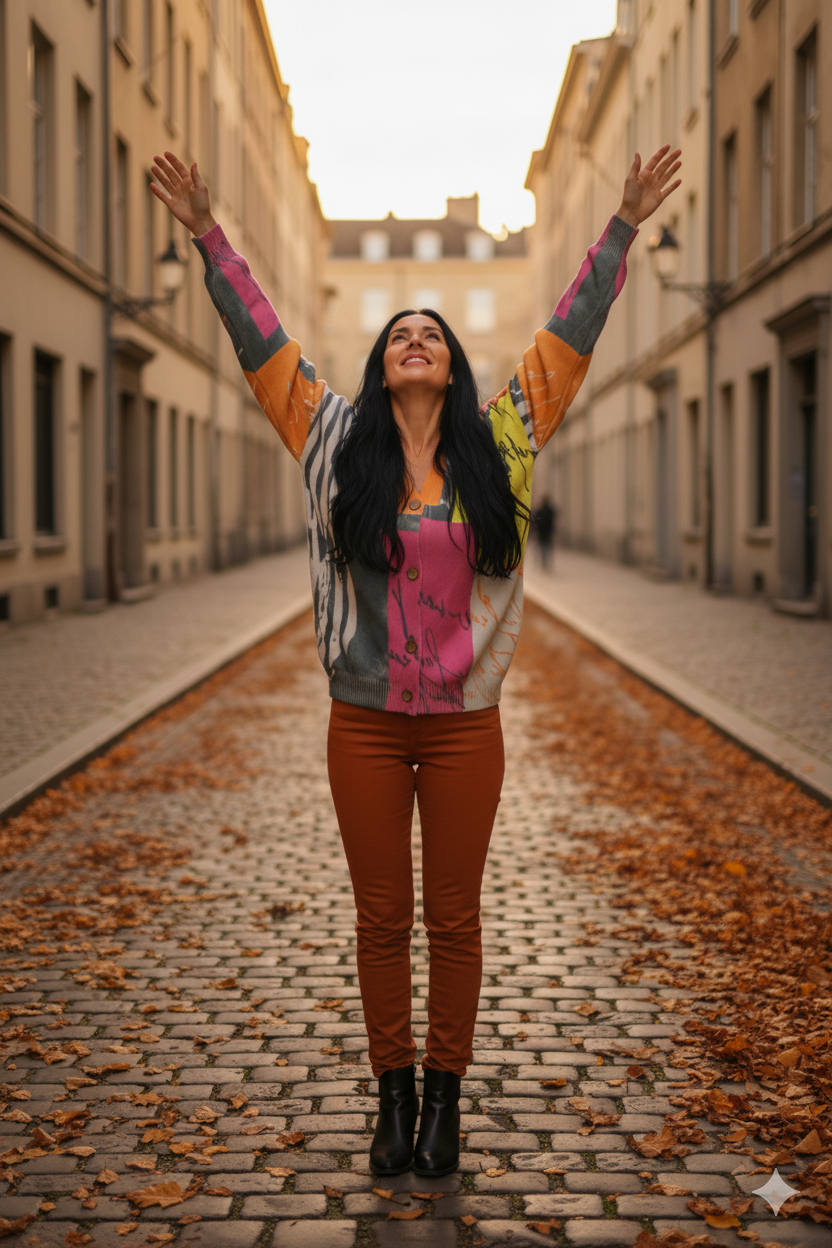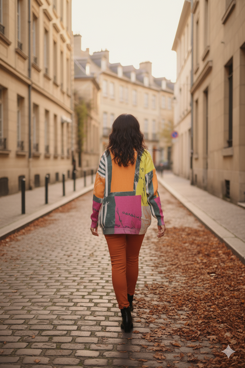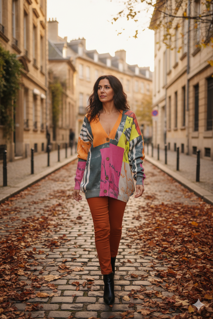 Tento svetrík je ako abstraktné umelecké dielo. Pútavý a famózne pestrofarebný. Na ľavom pleci sa nachádza vzor dievčaťa v pásikavej čiernobielej sukni s červeným dáždnikom. Zapínanie na štyri gombíky.