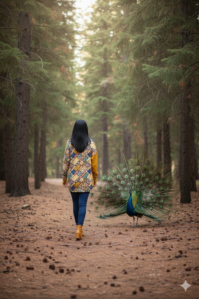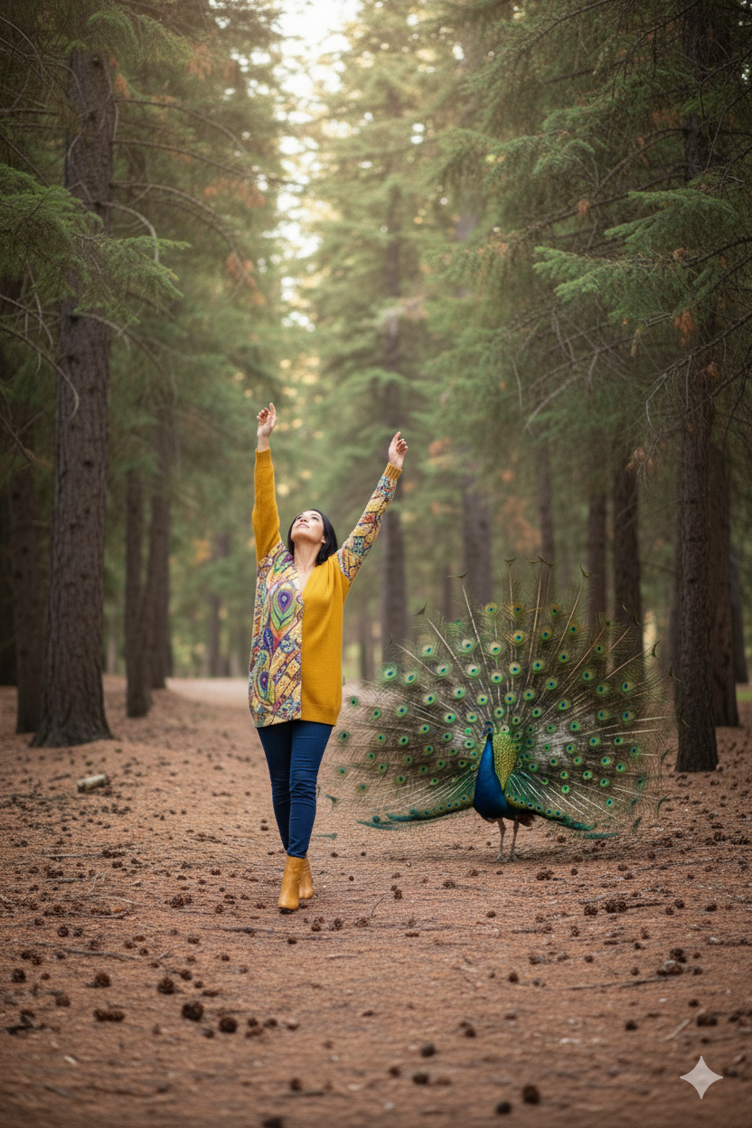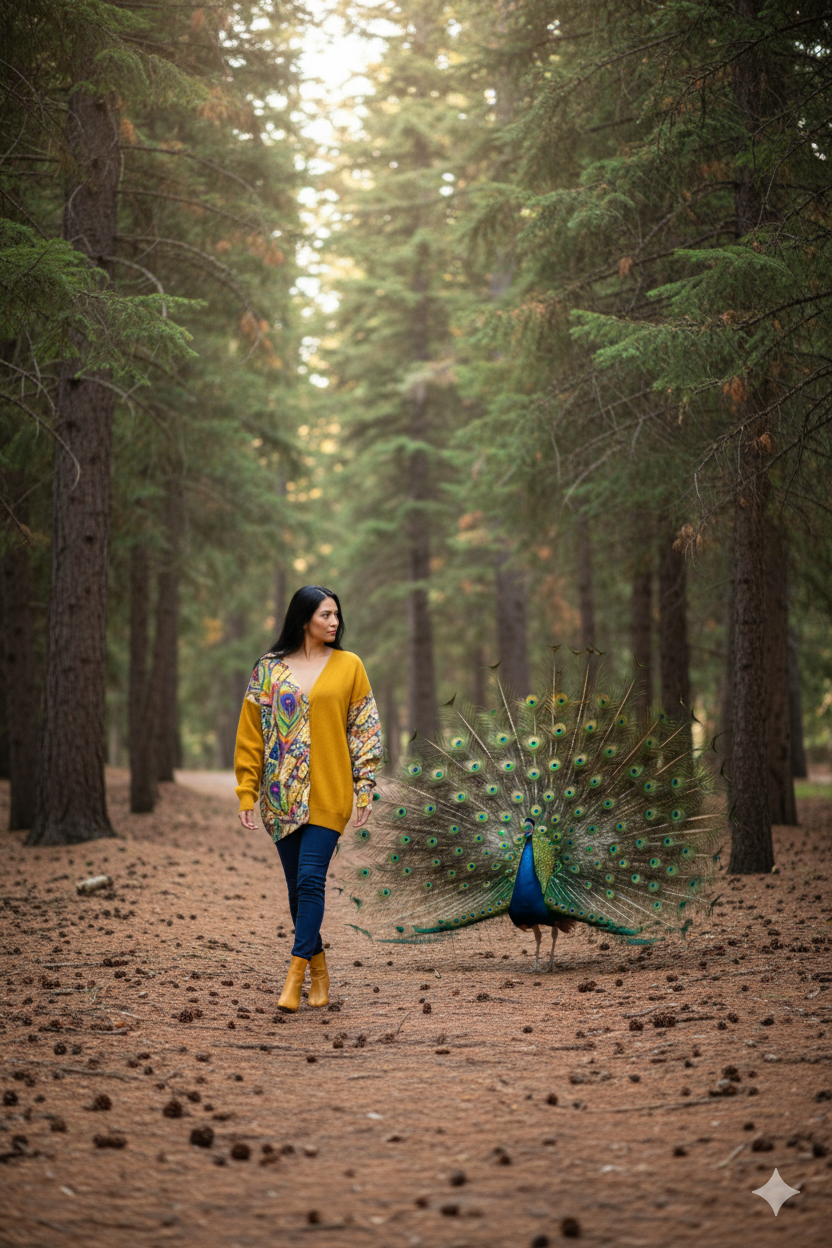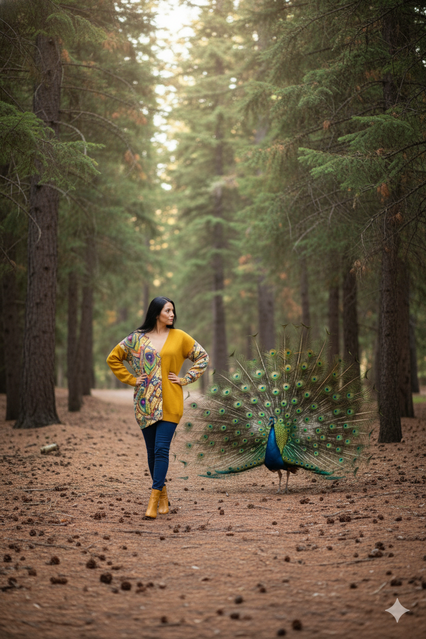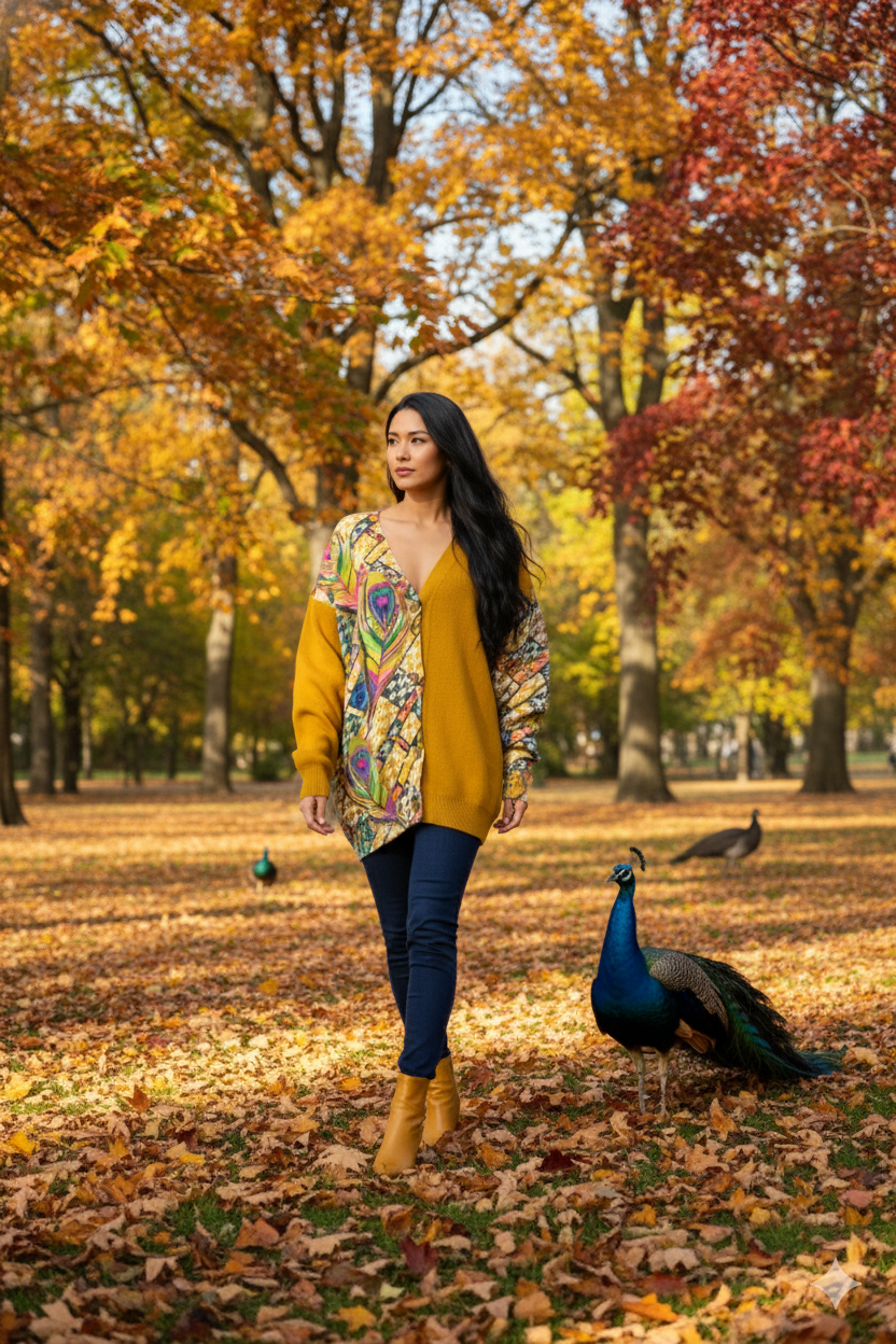 Štýlový svetrík s pekným abstraktným vzorom pestrofarebných pávích pierok na pravej prednej polke. Abstraktný farebný vzor na zadnej časti a na ľavom rukáve. Druhý rukáv je jednofarebný - horčicový. Zapínanie na štyri gombíky.