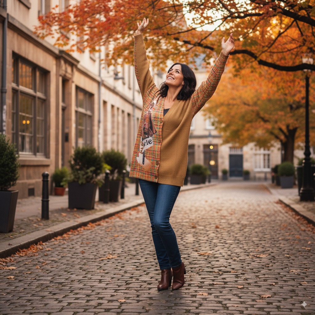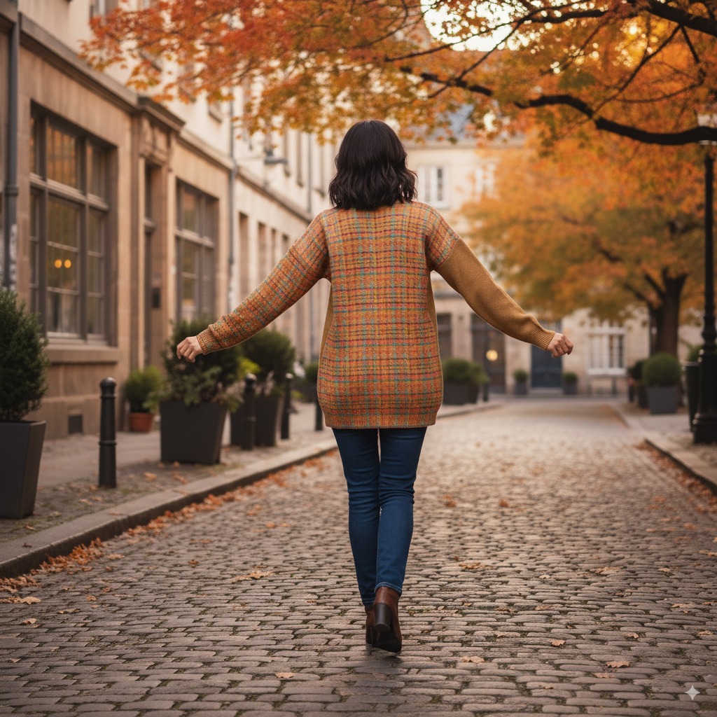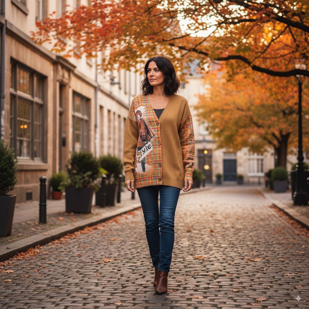Štýlový svetrík s pekným rozložením farieb a vzorov na rukávoch a aj na prednej a zadnej časti. Na pravej prednej strane so vzorom dámy v klobúku..