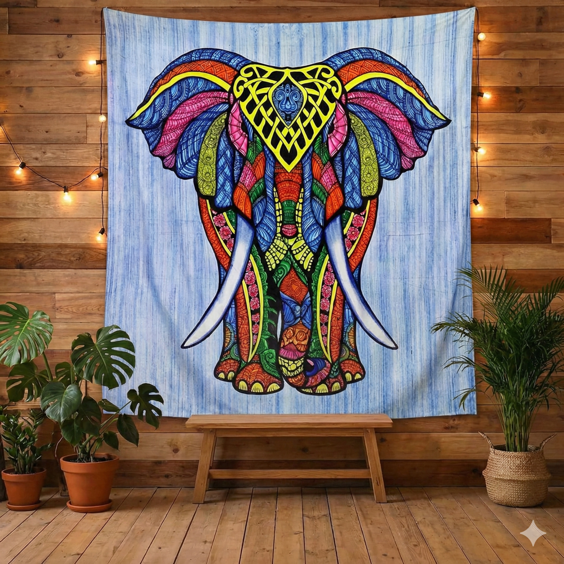 Tapiséria s krásnym ručne vymaľovaným vzorom slona na pevnej látke.