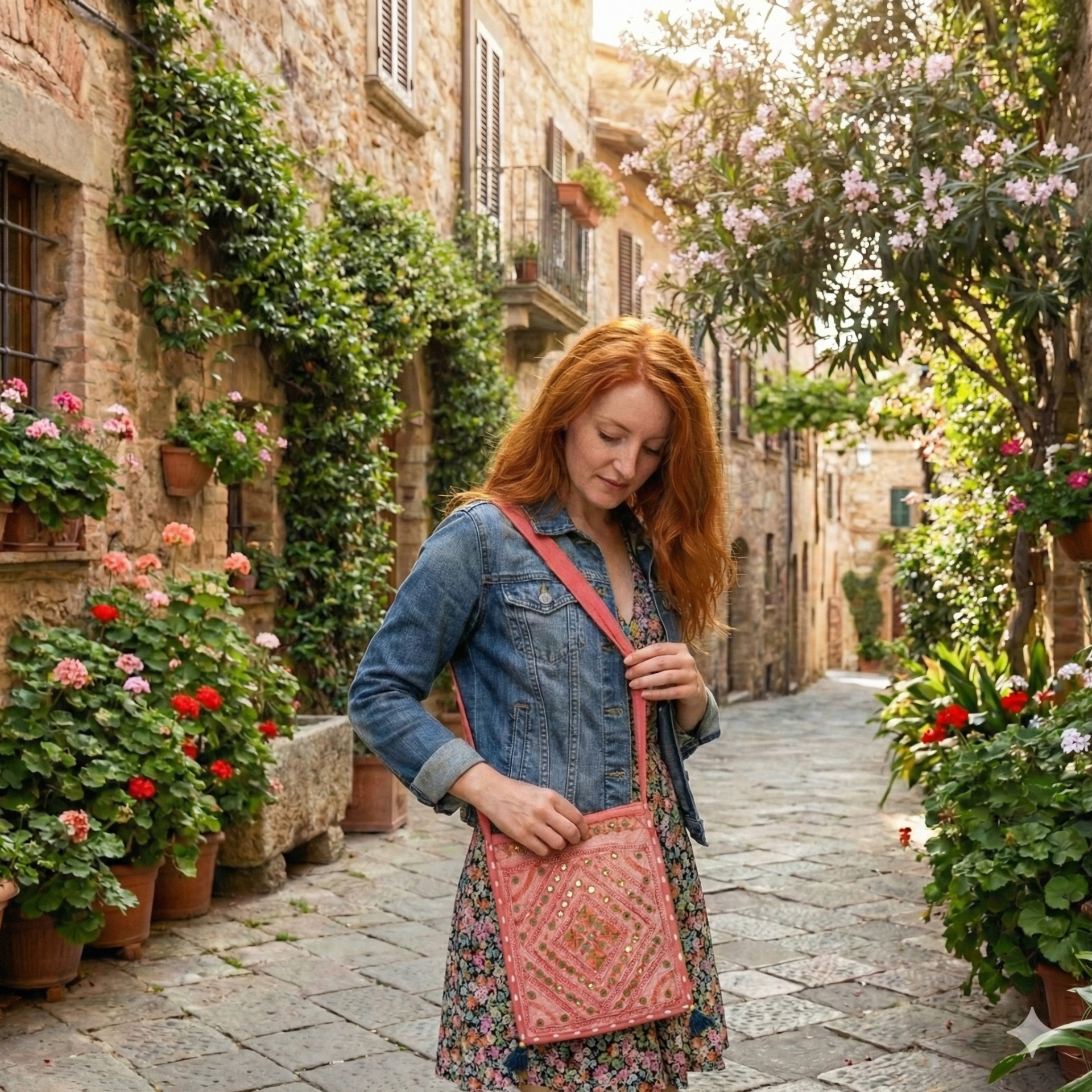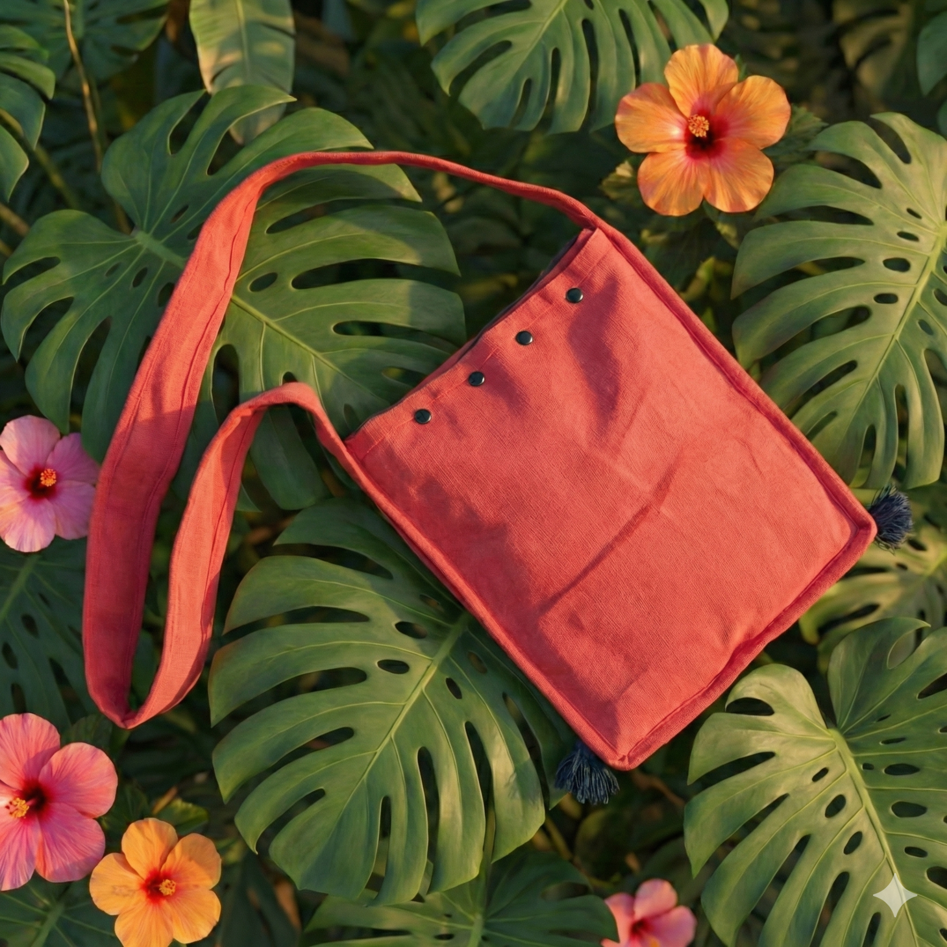 Ružová taška s lesklými okrúhlymi mini zrkadielkami a vyšívanými aplikáciami. Vyrábaná ručne v Indii.