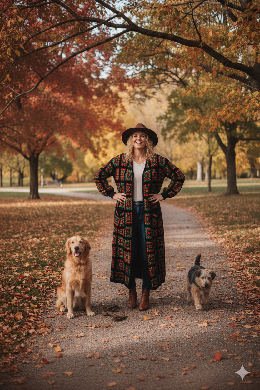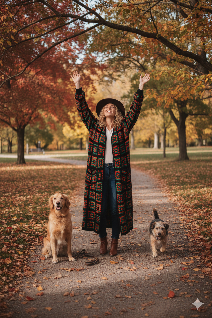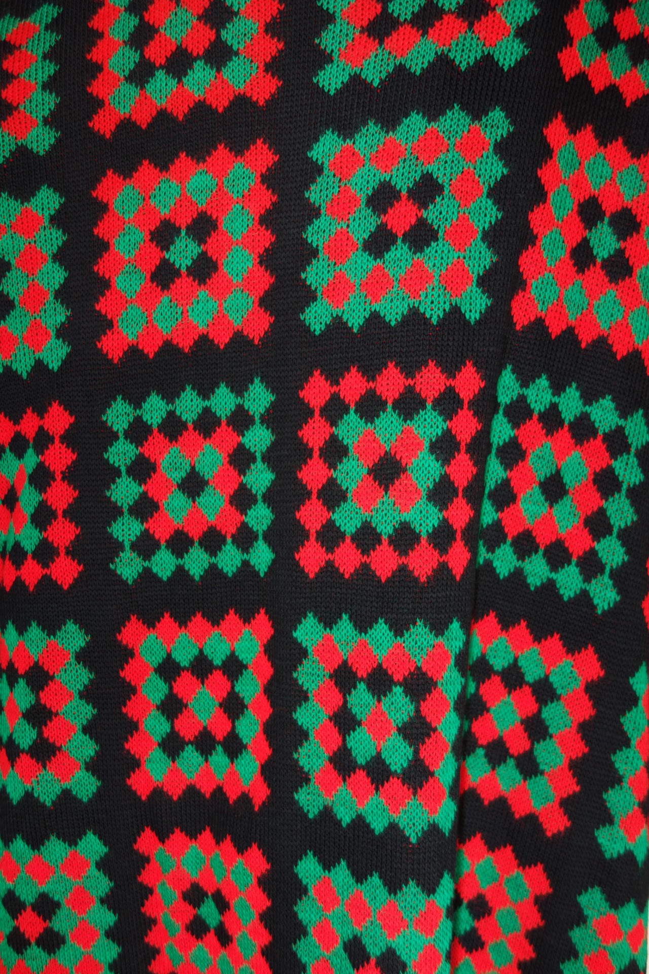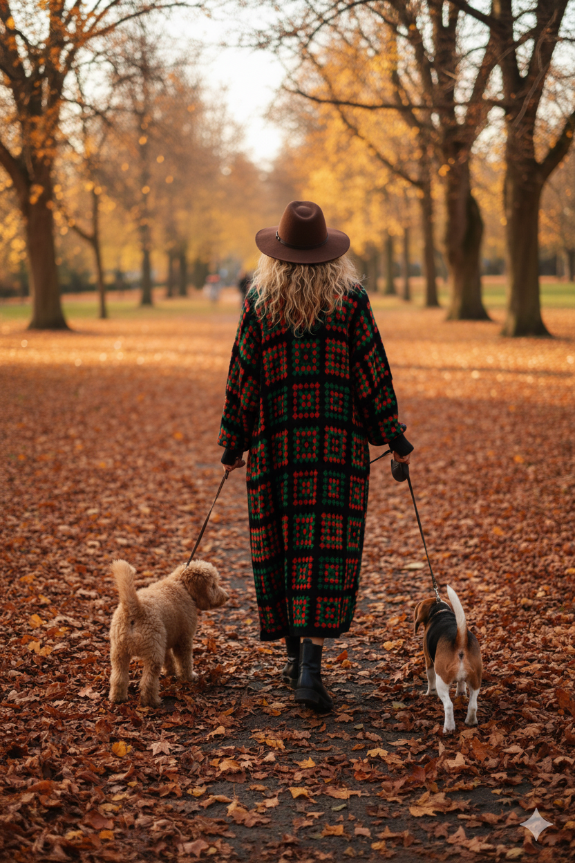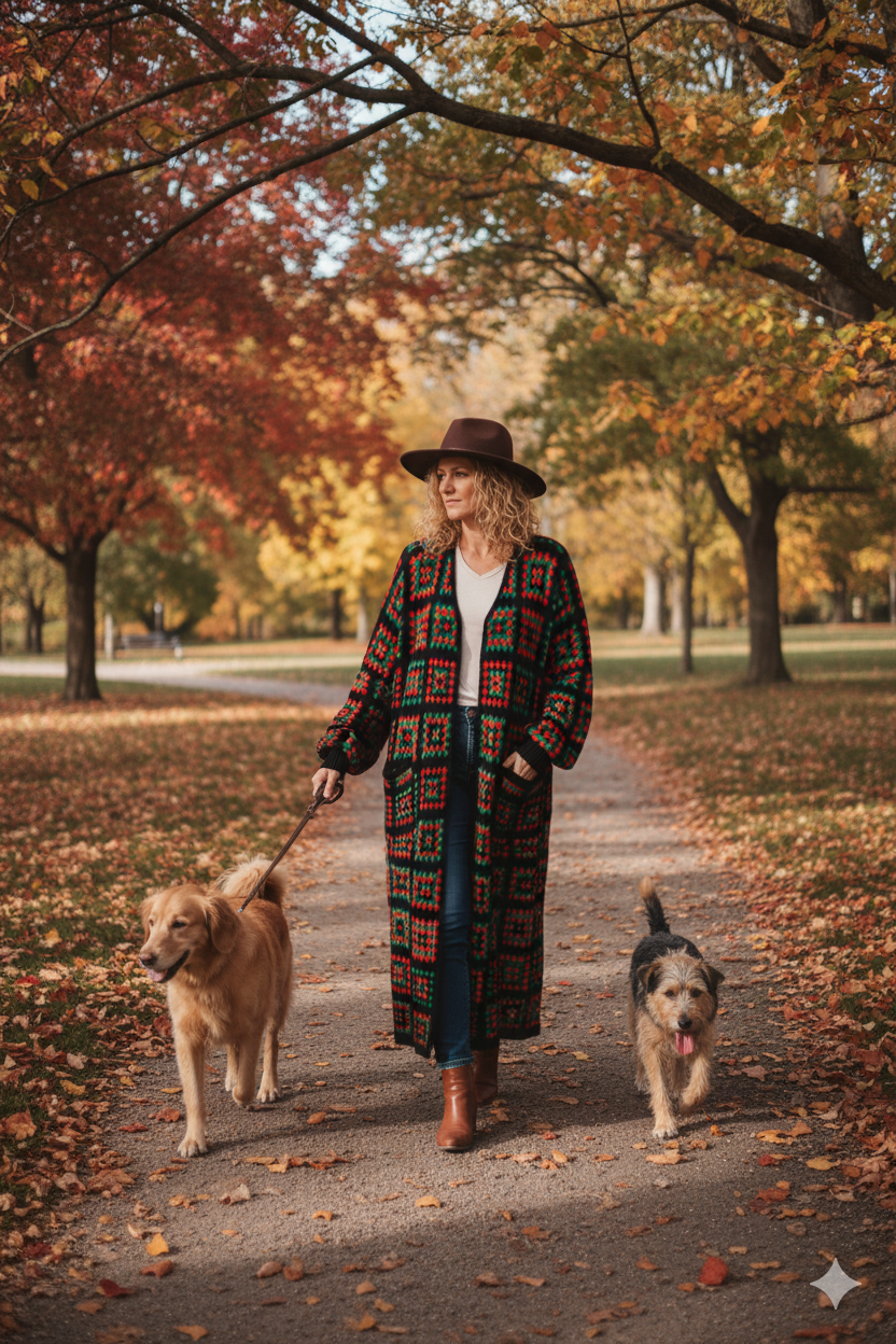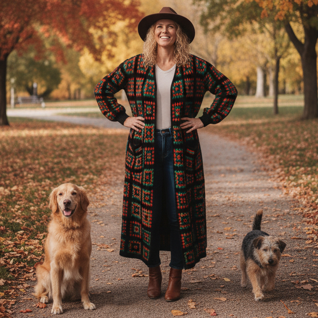 Dlhý kardigán s čierno-červeno-zelenými štvorcami s pačvork dizajnom. Vlnený úplet zahreje v chladných jesenných či zimných dňoch. Pôsobí veselo a zároveň elegantne. Strih je rovný, široký a voľný. Široký rukáv od pleca a na konci pri ruke zúžený a obtiahnutý. Vrecká po bokoch.