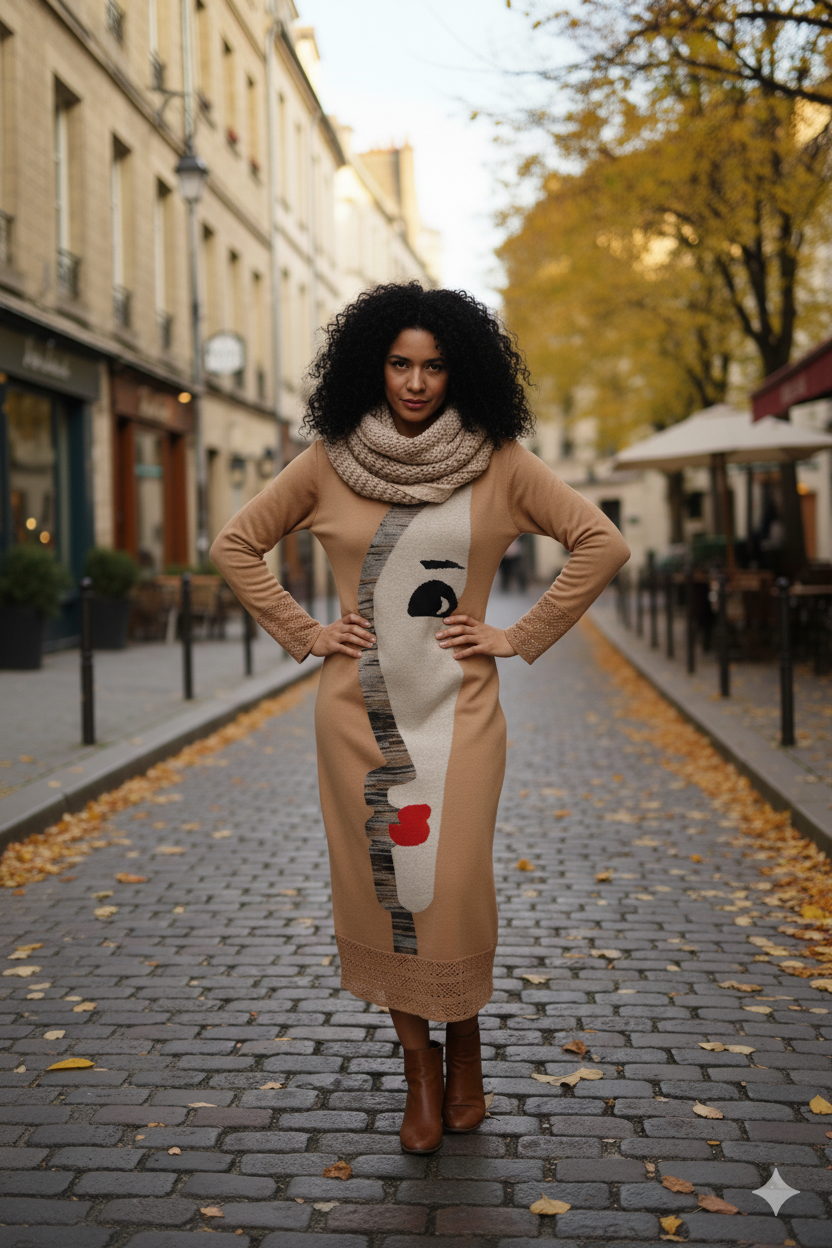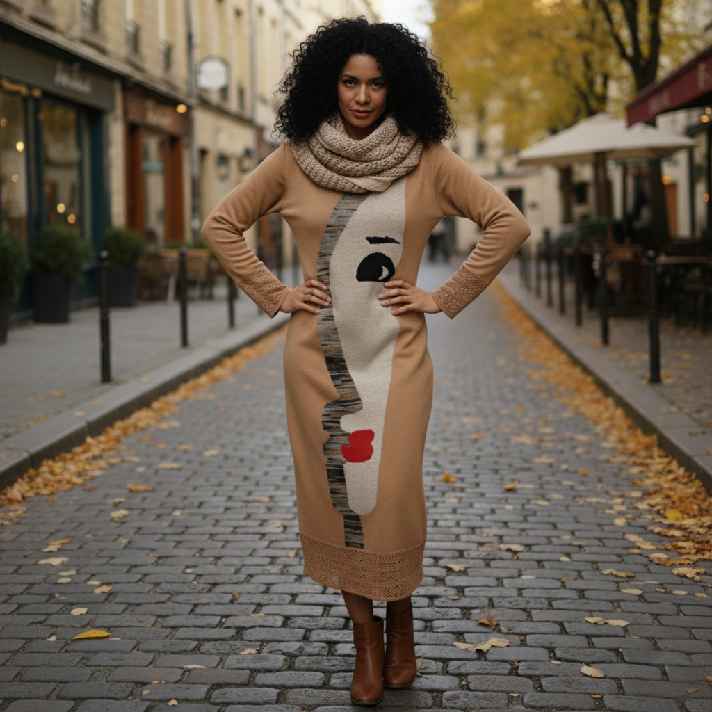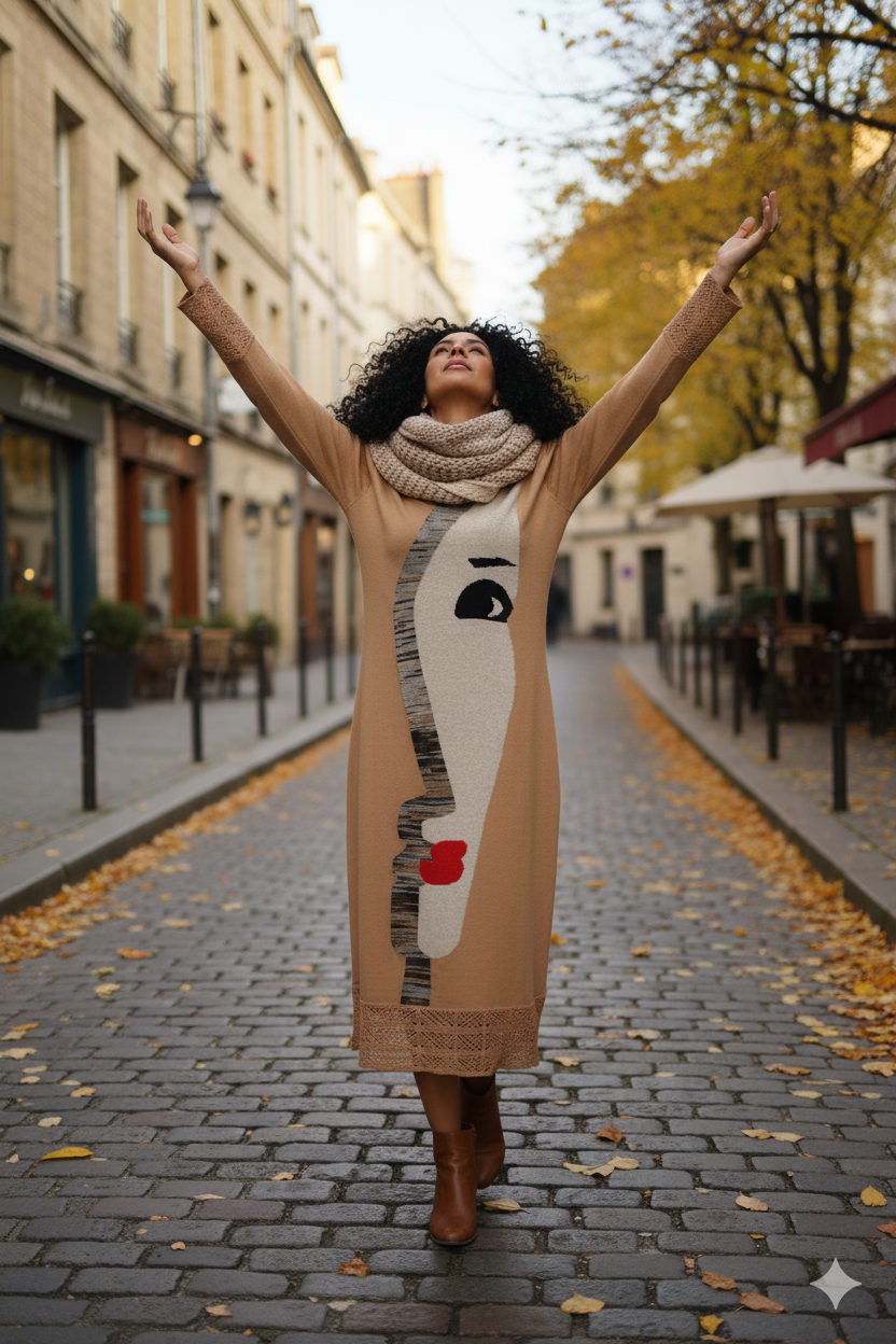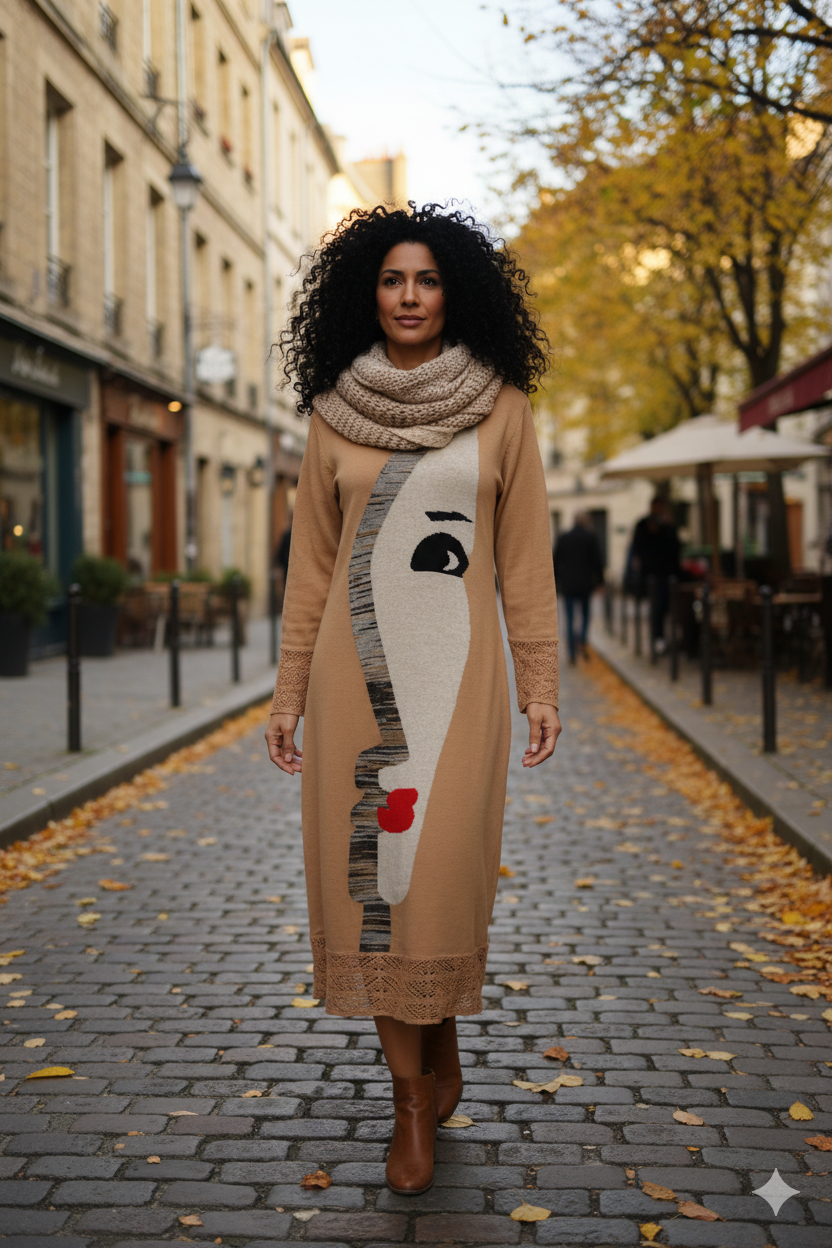 Úpletové šaty svetlohnedej farby s abstraktnou tvárou po celej dĺžke a čipkou na rukávoch a na spodku. Teplý materiál pletený s vlnou vás v chladných mesiacoch príjemne zahreje a zároveň poteší svojou umeleckou nevšednosťou vás aj okolie. Vhodné k rôznym druhom hrubších zimných pančúch.