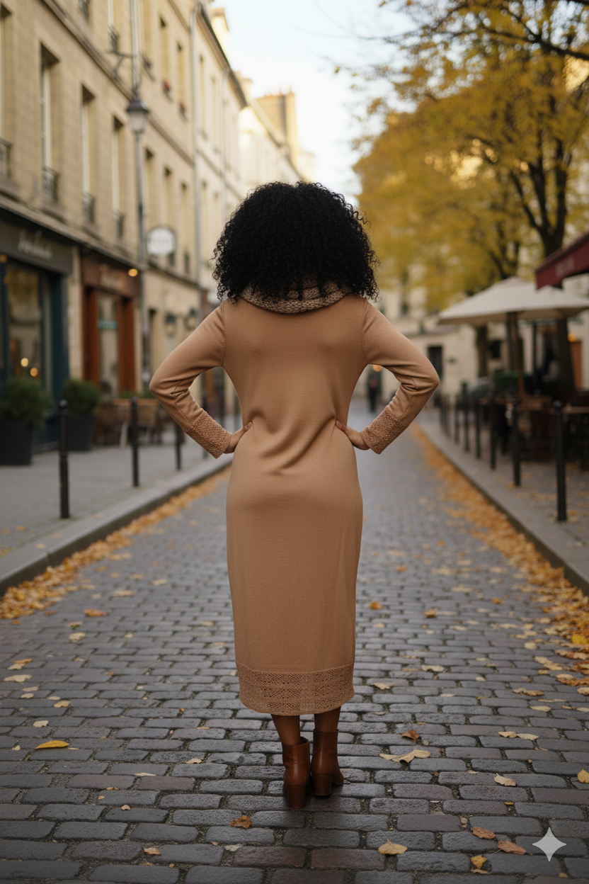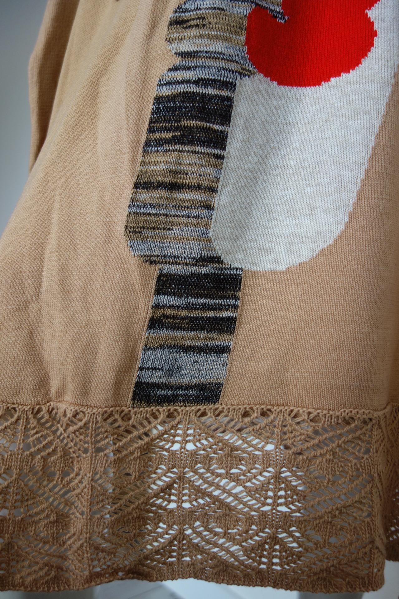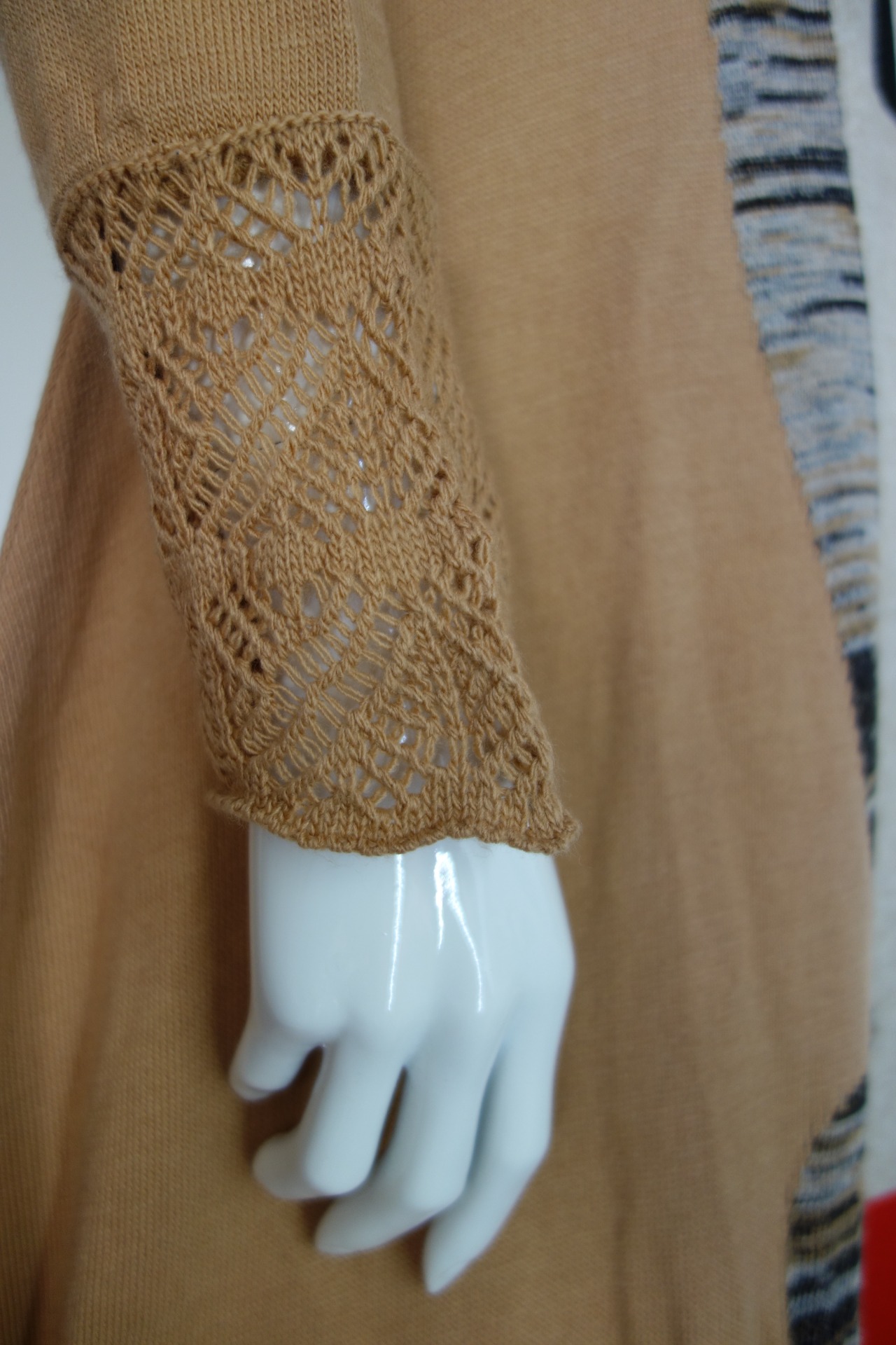 Úpletové šaty svetlohnedej farby s abstraktnou tvárou po celej dĺžke a čipkou na rukávoch a na spodku. Teplý materiál pletený s vlnou vás v chladných mesiacoch príjemne zahreje a zároveň poteší svojou umeleckou nevšednosťou vás aj okolie. Vhodné k rôznym druhom hrubších zimných pančúch.
