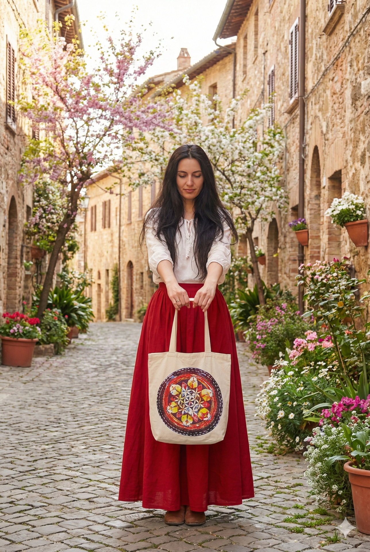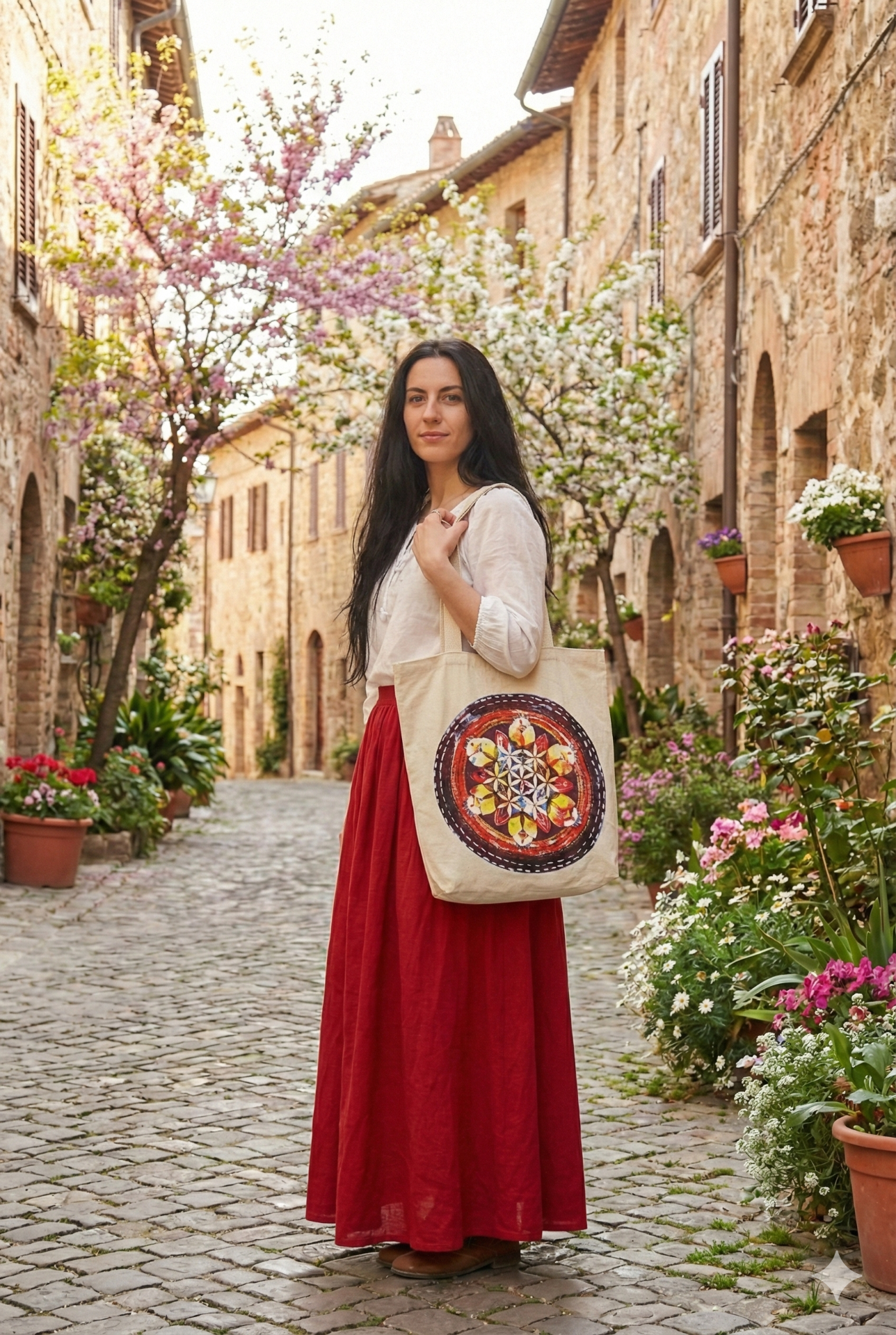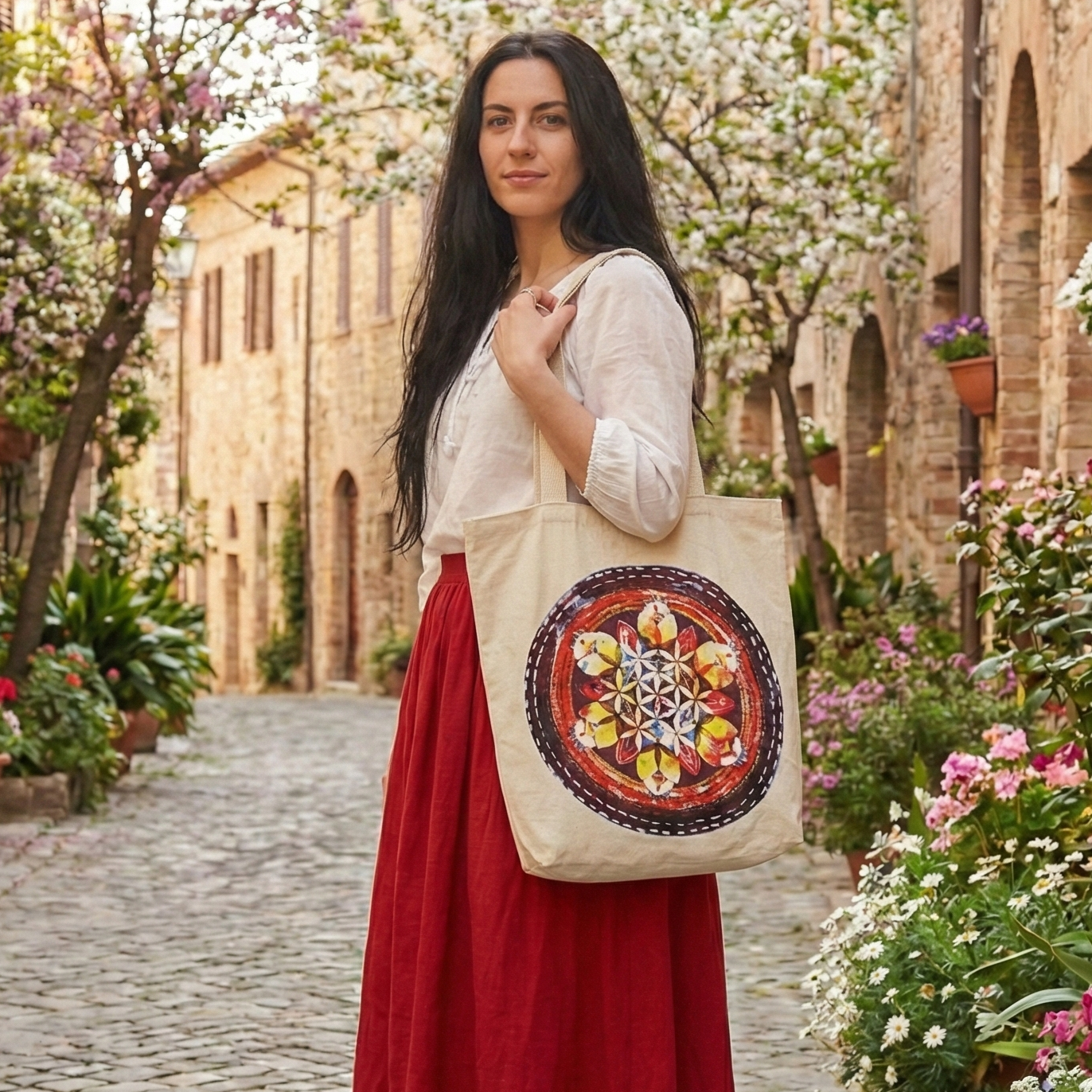 ˇVeľká plátená bavlnená taška so vzorom kvetu života vsnovného v okrúhlej mandale.