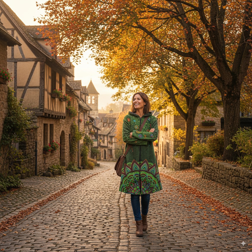 Dlhý zateplený mikinový kabát s mandalou na spodku s peknými vyšívanými aplikáciami. Zapínanie na zips. Vnútorná časť je príjemne zateplená flísom. Kabát má vnútorné vrecko na ľavej strane hrudi.